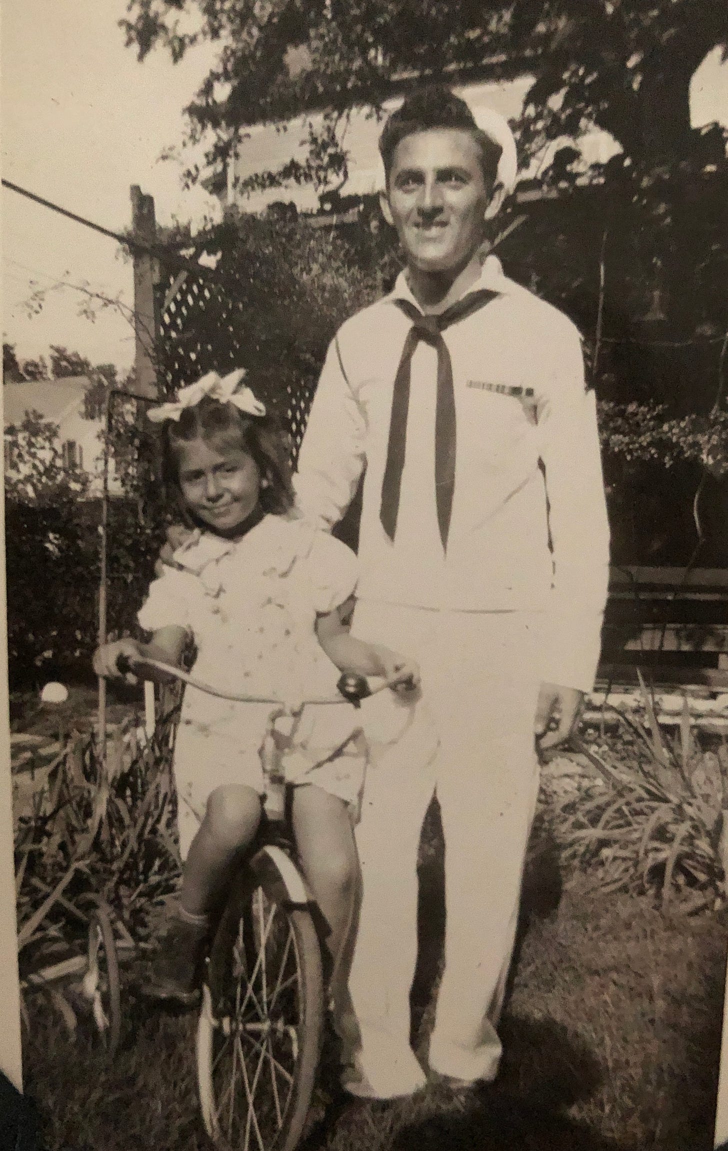 Just before Halloween, when I was twelve, I decided it was finally time to explore the third-floor hall closet that had always piqued my curiosity. I had put it off for far too long, and risked invading a space that might be occupied by the third floor tenants: Uncle Giro and Aunt Fifi. Inside that long closet that disappeared into the darkness of the eves, I discovered a trunk filled with my father’s sailor uniforms: Dress White, Dress Blue, a Cap, white hat (also known as a Dixie cup), and a pea coat. Dad had served in World War II, taking part in the South Pacific Campaign. I hadn’t yet decided on a Halloween costume, so I tried on the white sailor pants, jumper, neckerchief and Dixie cup. I was stunned to find that it fit my petite twelve-year-old frame—Dad had once been my size! I had a costume, and I was thrilled. When I told Dad how well it fit, he laughed.