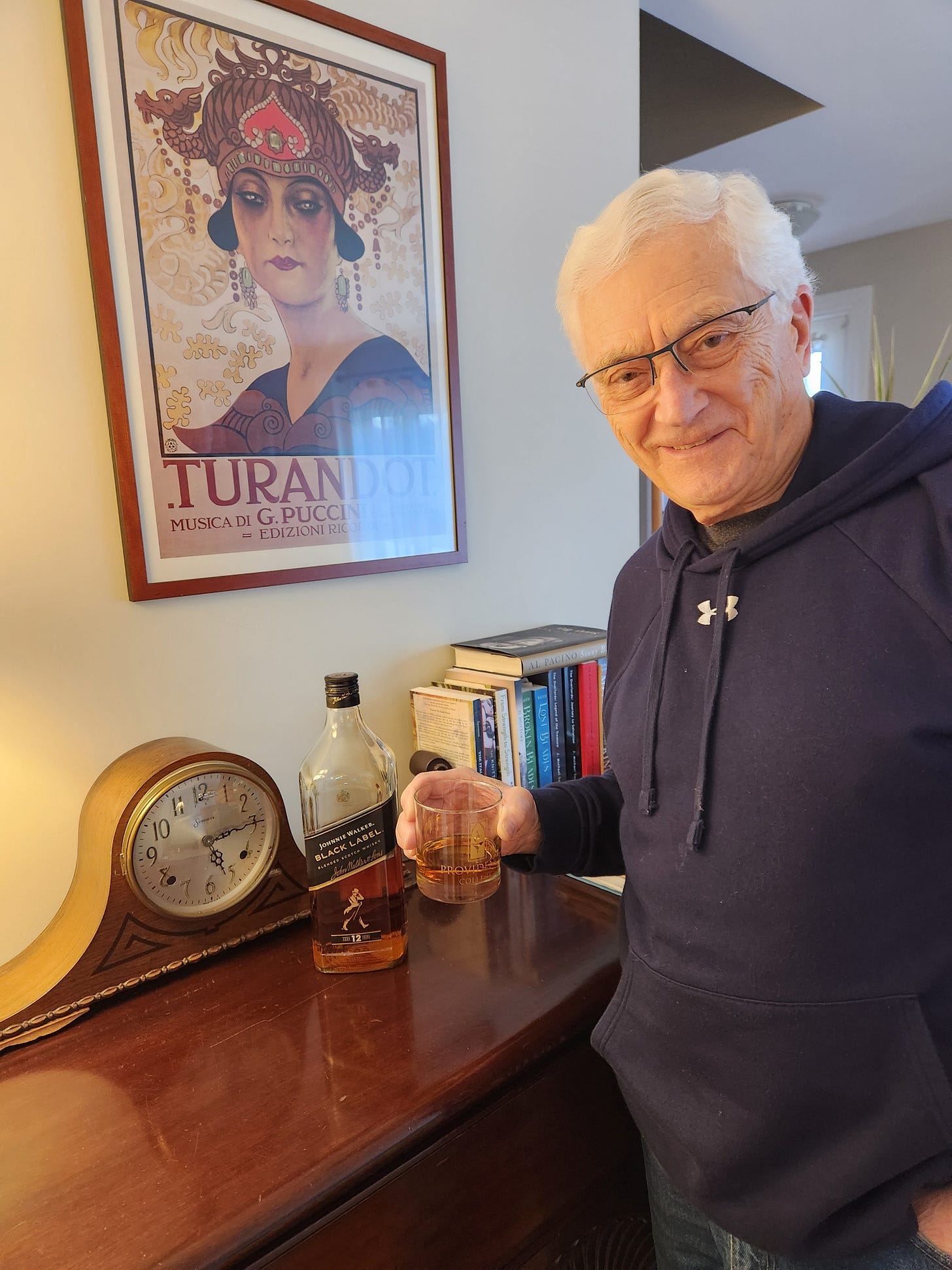 First, a one-finger pour because I liked saying, “I’ll have a one-finger pour, neat.” It was neat and it sounded neat. Now I squeeze just a little more; enough to reach the bottom line of The Providence on my Providence College gift glass. “Lookin’ more like two fingers to me.” A familiar voice in the background.